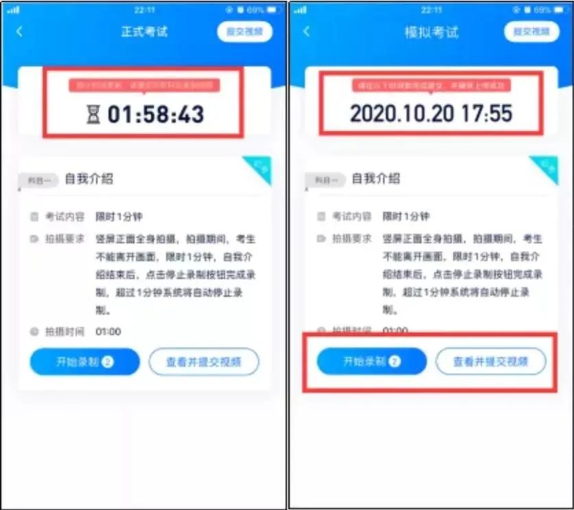 部分考试的页面上方为计时考试,部分为提交截止时间,请根据系统提示完成录制并提交视频。