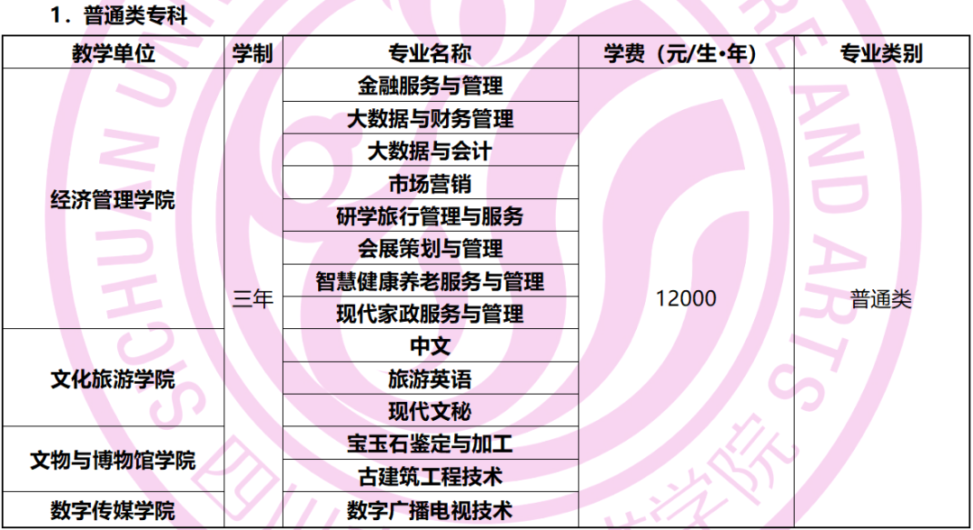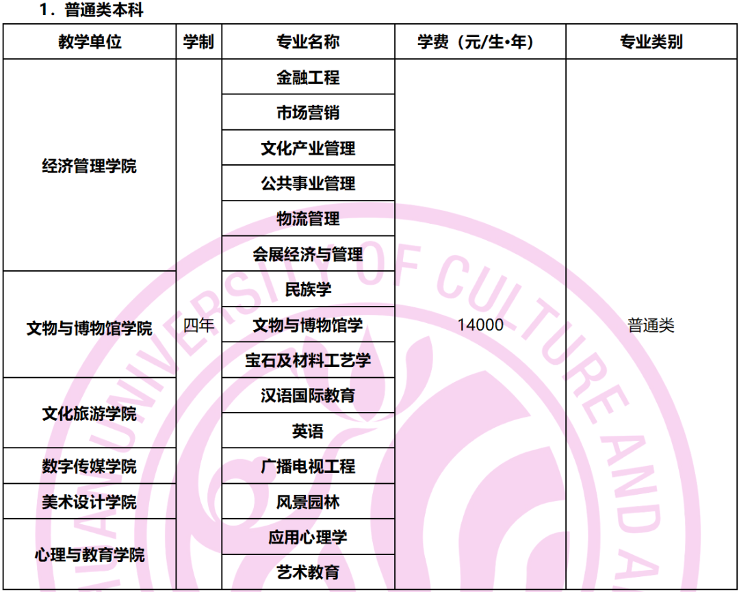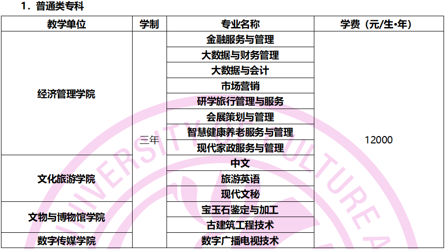 金融工程、市场营销、文化产业管理、公共事业管理、物流管理、会展经济与管理、民族学、文物与博物馆学、宝石及材料工艺学、汉语国际教育、英语、广播电视工程、风景园林、应用心理学、艺术教育本科专业;金融服务与管理、大数据与财务管理、大数据与会计、市场营销、会展策划与管理、智慧健康养老服务与管理、现代家政服务与管理、研学旅行管理与服务、中文、旅游英语、现代文秘、宝玉石鉴定与加工、古建筑工程技术、数字广播电视技术:只需参加全国普通高等学校招生统一文化考试。