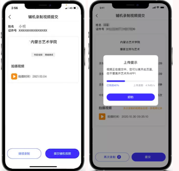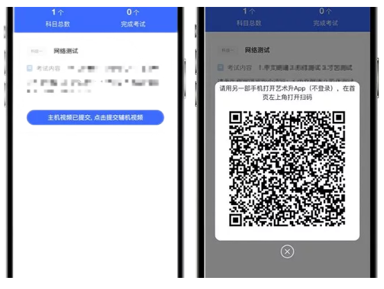 录制完成后,考生可以提交视频。首先提交手机A也就是主机中的视频,如果有多次录制机会,可以选择你最满意的一段视频进行提交;主机视频提交完成后会跳回科目列表,不允许再次修改,提交后的科目会显示“主机视频已提交,点击提交辅机视频”,点击后会再次跳出二维码,使用手机B也就是辅机扫码后,点击提交会自动选择与主机对应视频,辅机视频也提交完成后,该科目考试完成;所有科目的主辅机视频都提交后,才算完成考试。