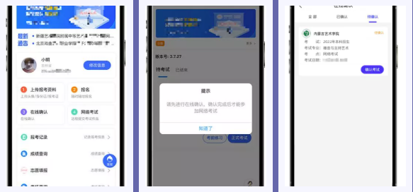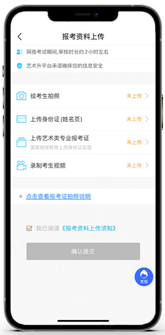 在线确认报名的考生必须在“艺术升”报名系统完成报考资料上传,具体采集信息包括:拍摄免冠一寸照、上传身份证姓名页、上传艺术类专业报考证、拍摄5秒语音视频。