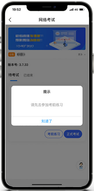 考生进入“网络考试”菜单后可选择进行考前练习,没有参加考前练习的考生将无法进行正式考试。考生可以通过多次模拟考试,熟练掌握考试流程,确定好拍摄的最佳距离、角度和位置。