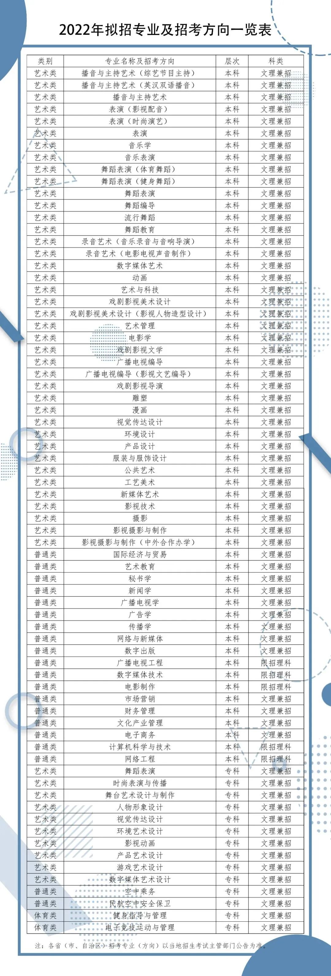 2.根据专业特点和人才培养工作需要,我校在部分专业中按需设立招考方向(专业后加括号注明),并根据当年教育部和各省(自治区、直辖市)颁布的有关规定执行。