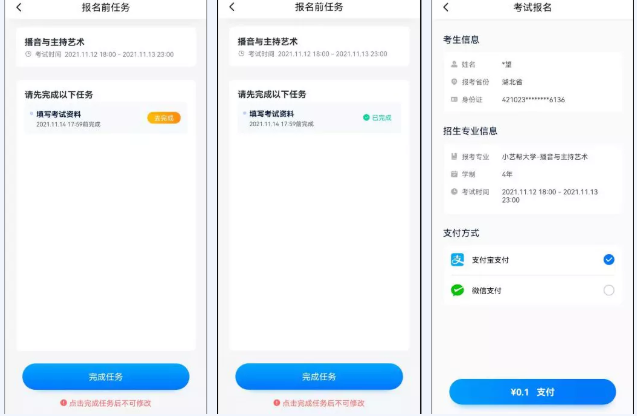 4)按要求填写各任务,点击完成任务进入缴费页面,支付后即可完成考试报名。若无报名前任务填写要求则不用处理。