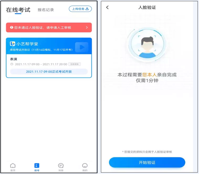首次视频考试前需要进行人脸验证,注意【报考】页面屏幕上方红色条,点击开始验证,按提示进行人脸验证,验证完成后方可参加考试;根据语音提示进行人脸识别,不要化浓妆、戴美瞳等,验证时调整好光线,不要出现高曝光的情况,保证人脸清晰,避免人脸识别失败。