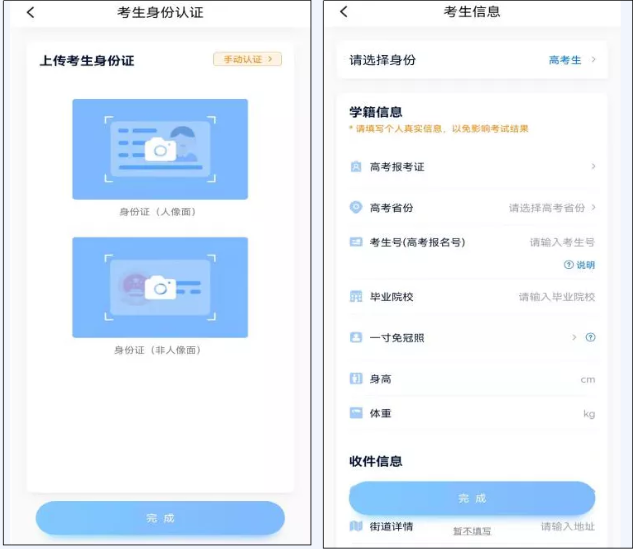 2.选择身份为“高考生”,按照指引填写学籍信息,即可完成认证。请务必根据实际情况填写。