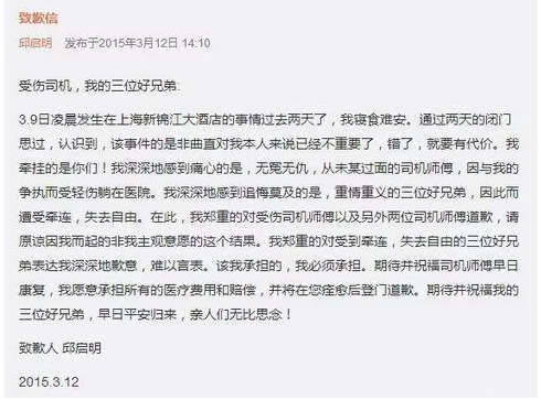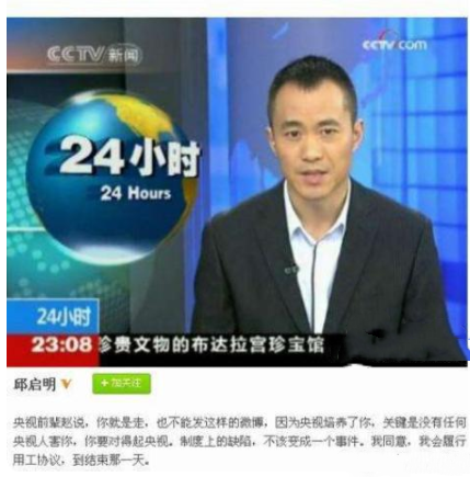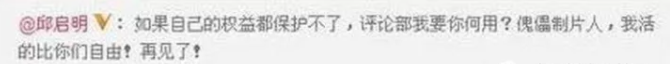2012年3月23日,邱启明发了一条微博,在互联网上掀起巨浪:“如果自己的权益都保护不了,评论部我要你何用?傀儡制片人,我活的比你们自由!再见!”