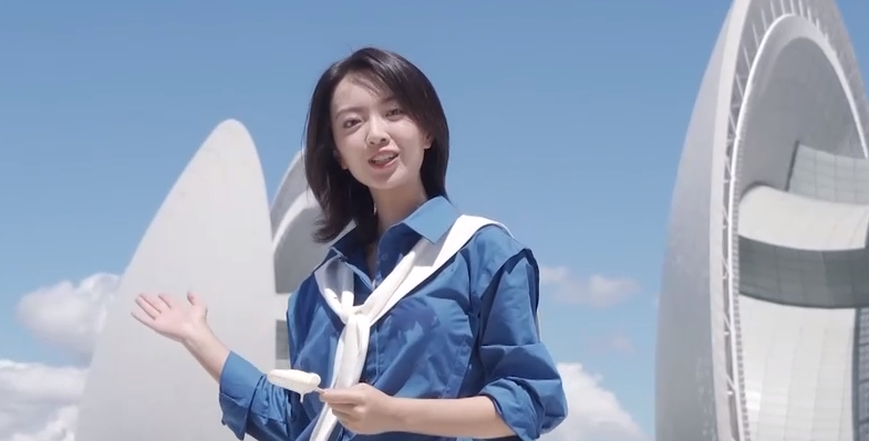 《行走珠海》里,她穿着蓝色的衬衣,戴上一条白色的围巾,齐肩的长发随着海风飞舞,这简简单单的造型就足以惊艳众人。
