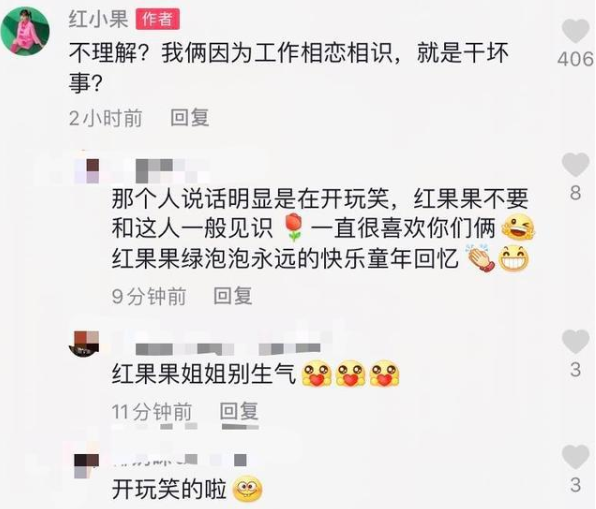 红果果在微博回怼网友“我就知道这两个人在智慧树下没干什么好事” 的发言,并称与搭档“绿泡泡”是正常恋爱生儿育女,“合法夫妻,一不偷二不抢,请问干了什么坏事儿?”