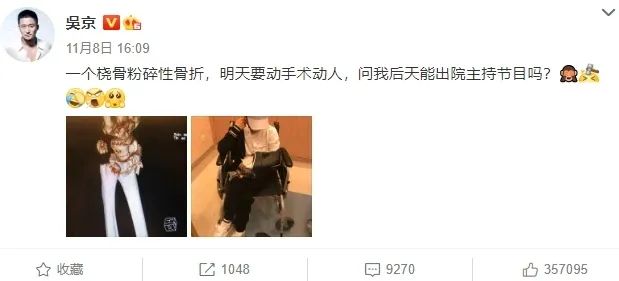 吴京曾在社交平台上发文称谢楠桡骨粉碎性骨折,并且明天需要在医院动手术,