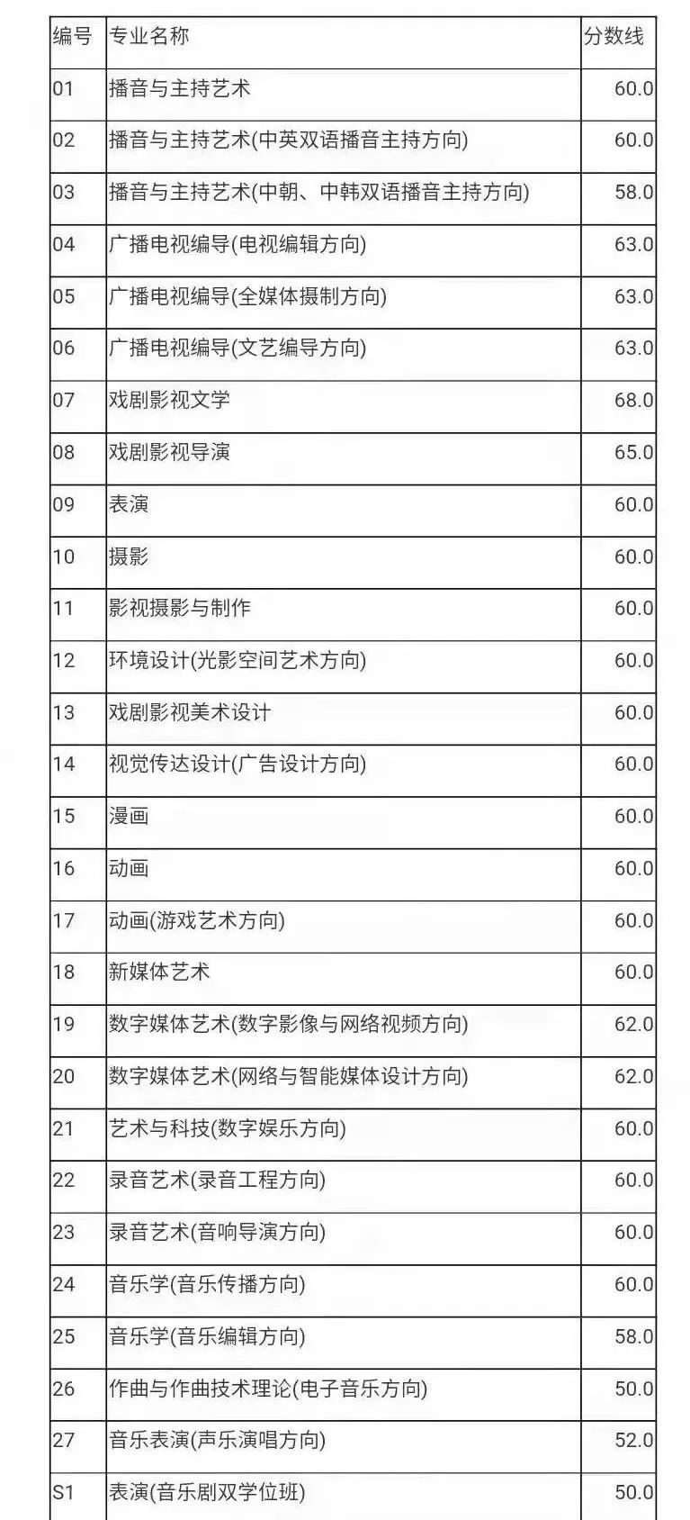 中国传媒大学2022年艺术类本科招生初试合格分数线