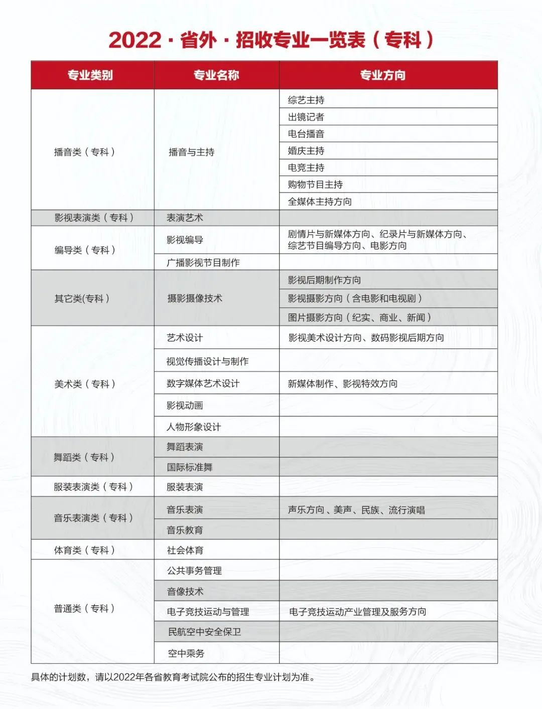 3、播音与主持艺术专业、表演专业:发音器官无疾病,无色盲、无夜盲,五官端正;男生 身高 170cm 以上,女生身高 160cm 以上。