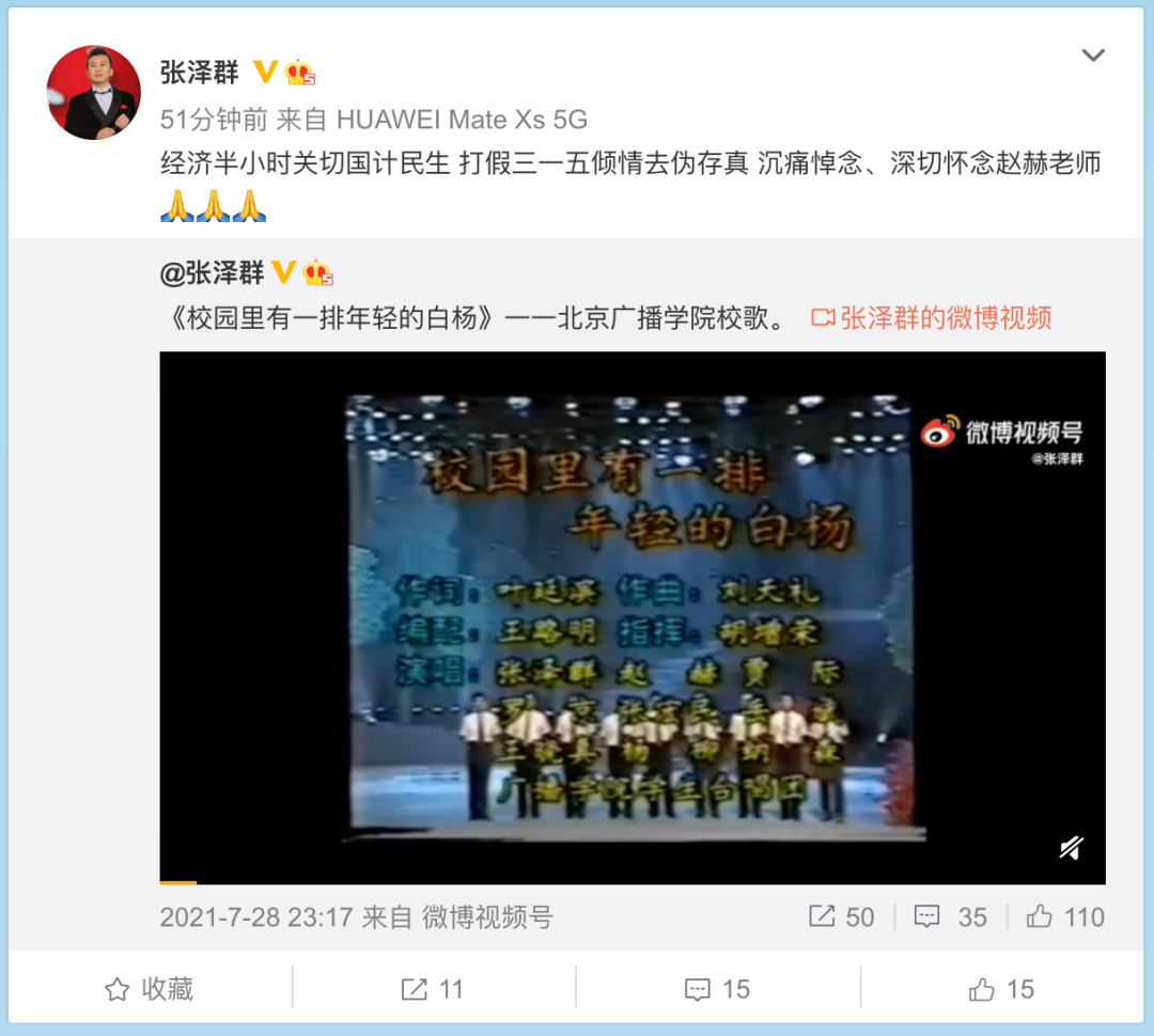 张泽群写道:“经济半小时关切国计民生,打假三一五倾情去伪存真,沉痛悼念、深切怀念赵赫老师。”