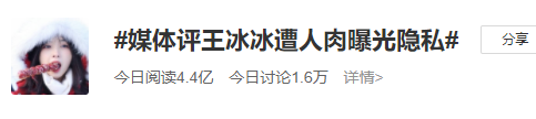 目前 #媒体评王冰冰遭人肉曝光隐私#话题