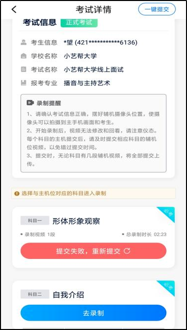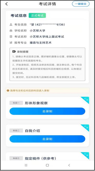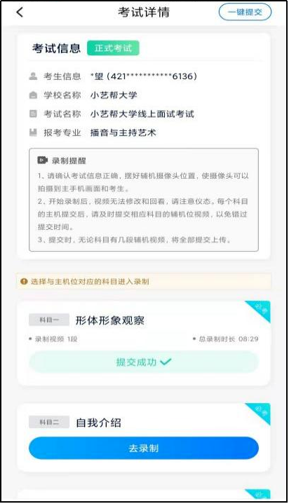 正式考试时,主机科目录制完成并提交完毕后,辅机才可提交对应科目的视频或者最后一键全部提交。录制完的视频无法查看,也不可更改。