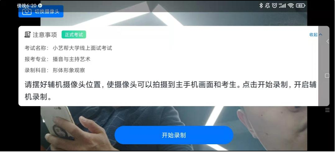 进入录制界面后,根据自己的需要切换前后置摄像头,按照学校的要求摆放主辅机位,随后点击“开始录制”按钮进行录制,请务必在主机开始考试录制视频前开启辅机录制,以免影响考试时间。
