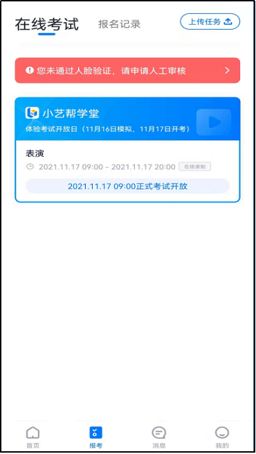 首次视频考试前需要进行人脸验证,注意【报考】页面屏幕上方红色条,点击开始验证,按提示进行人脸验证,验证完成后方可参加考试;根据语音提示进行人脸识别,不要化浓妆、戴美瞳等,验证时调整好光线,不要出现高曝光的情况,保证人脸清晰,避免人脸识别失败。