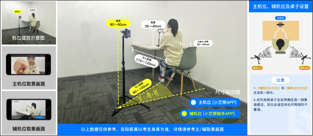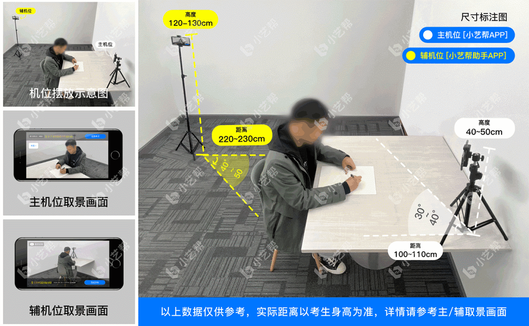 请提前架设好主机(小艺帮app)和辅机(小艺帮助手app)(摆放方法参照下方双机位摆放示意图),进入正式考试后,辅机先扫描主机位二维码,开启辅机位录制,详情见下方“双机位考试(小艺帮助手app为辅机位)”。