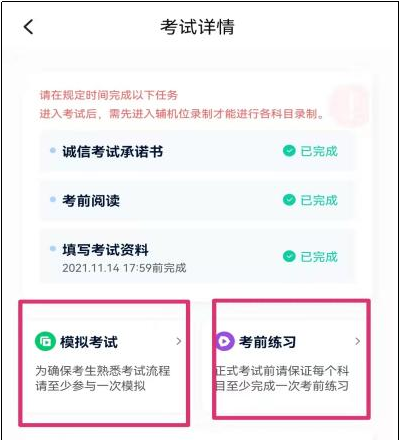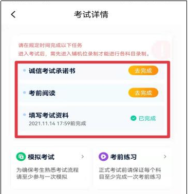 在【报考】页面【在线考试】列表中点击对应考试进入,考前需完成屏幕上方考前任务,部分考前任务有时间限制,请在规定时间内完成,以免影响正式考试。