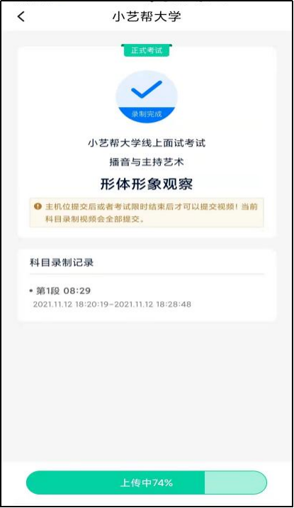 主机的正式考试视频提交后,请及时提交辅机对应录制科目视频。提交后即可看到上传进度,请务必关注视频上传进度,确保上传成功。
