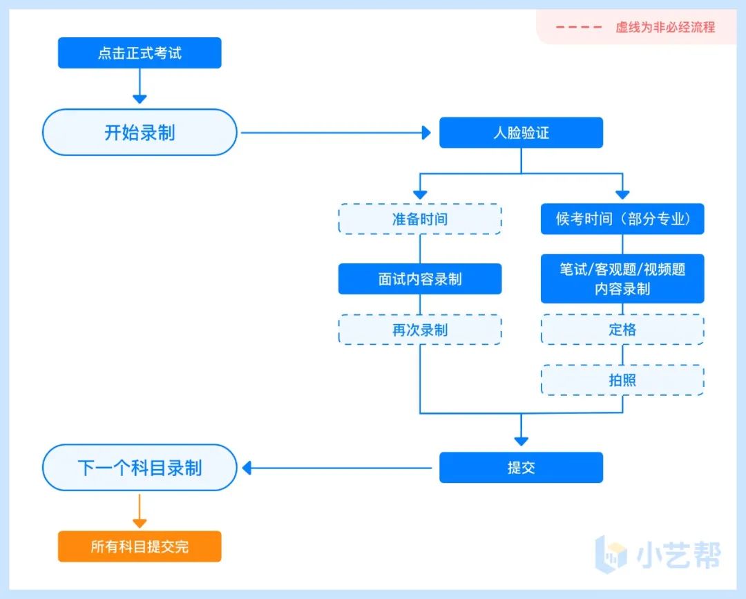 考生须调整好考试环境,该科目只有一次录制机会。请提前架设好主机(小艺帮app)和辅机(小艺帮助手app),进入正式考试后,辅机先扫描主机位二维码,先开启辅机位科目录制再开启主机位对应科目录制,详情见下方双机位考试(小艺帮助手app为辅机位)。考生在规定的准备时间内,调整好手机放置位置,耐心等待考试开始。