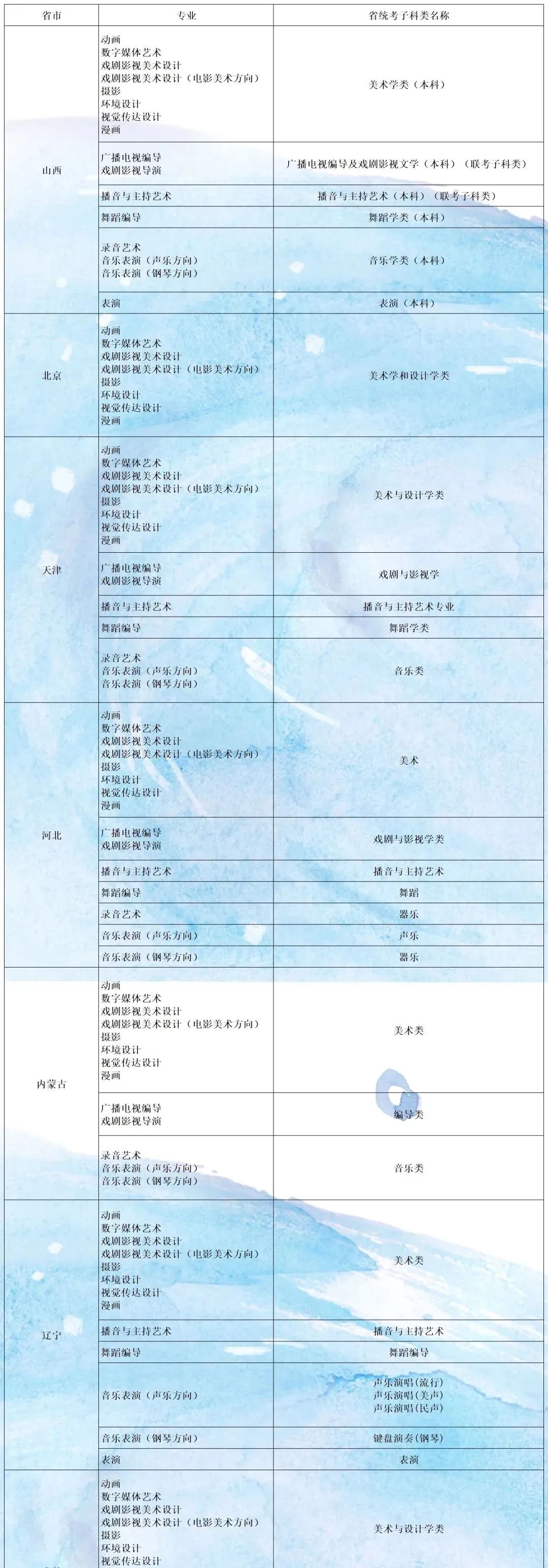 山西传媒学院2022年艺术类专业与省统考子科类对照表