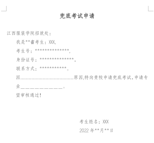 符合条件的考生可向学校提出书面申请,说明详细申请缘由(申请范本见附件1),并扫描或拍照发送至指定邮箱:250653420@qq.com,学校将在申请时间结束后第一时间回复审核结果。