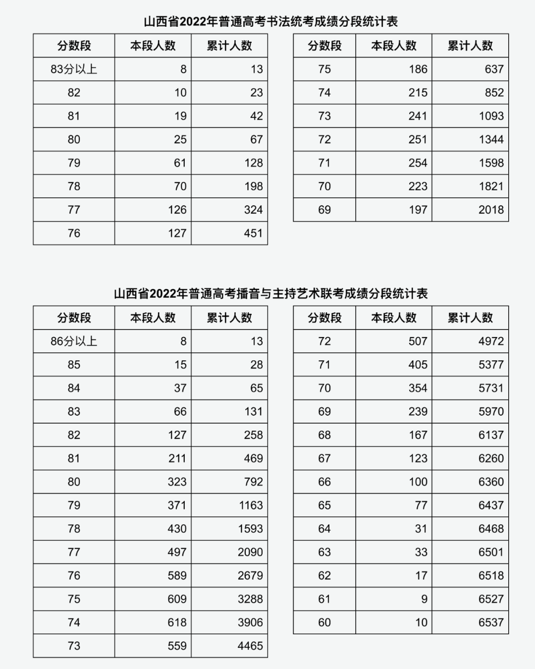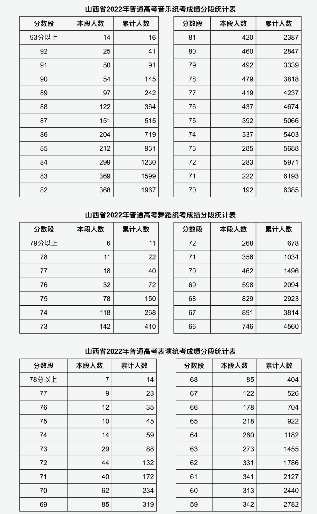 山西省2022年普通高校招生艺术类统考及联考有关专业成绩分段统计情况公布