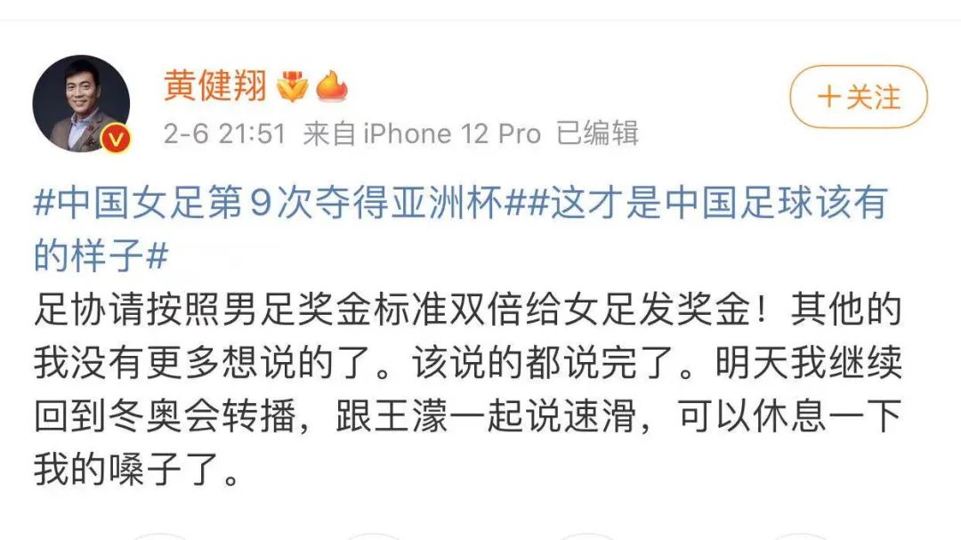 中国女足勇夺亚洲杯冠军后,黄健翔发博称:“足协请按照男足奖金标准双倍给女足发奖金!其他的我没有更多想说的了。该说的都说完了。明天我继续回到冬奥会转播,跟王濛一起说速滑,可以休息一下我的嗓子了。”