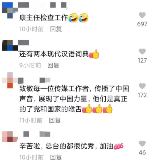网友看了刚强的工作环境之后,纷纷留言评论点赞。有人称自己看到了两本字典,实在是太辛苦了。也有人致敬每一位传媒工作者,称赞他们传播了中国声音,展现了中国力量。