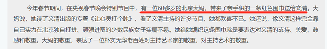 当年,文清还在央视做主持时,有一位60多岁的北京老奶奶,特意带了一条亲手织的红色围巾到电视台来当面送她。