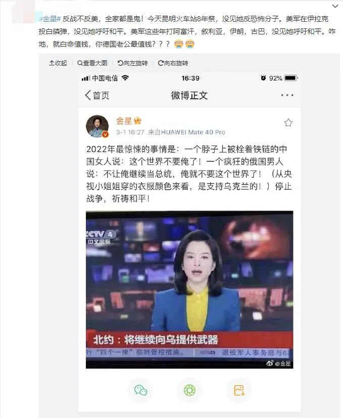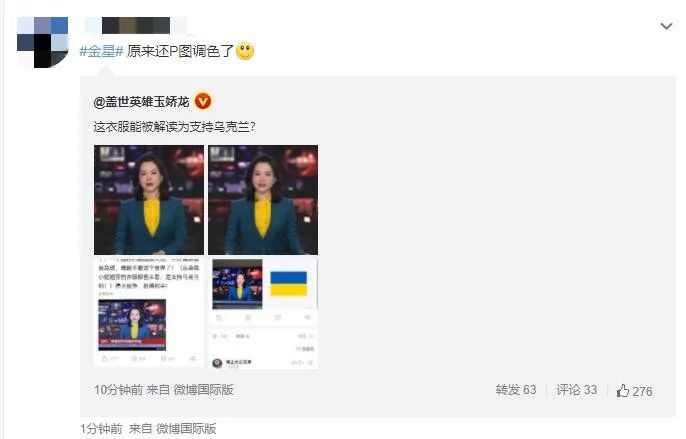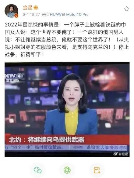 但眼疾手快的网友们立即截图并表示,该篇微博配图是由金星调色后发出,央视主播身穿衣服的颜色并非金星发出图片的颜色。