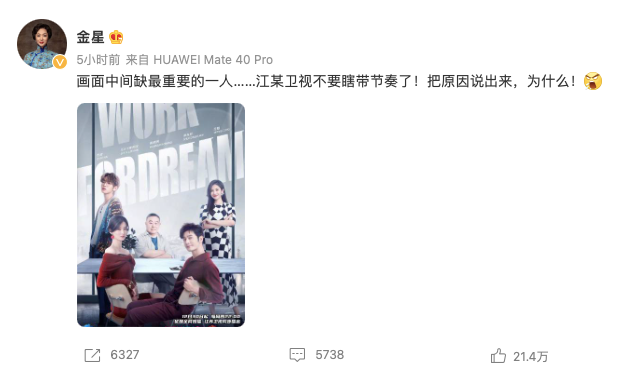 而在此之前金星声讨江苏卫视。通过个人社交平台发布了动态,配文道:“画面中间缺最重要的一人……江某卫视不要瞎带节奏了!把原因说出来,为什么!”在文字的最后还配上了一个生气咆哮的表情,可以看得出,金星的心情有多差了。