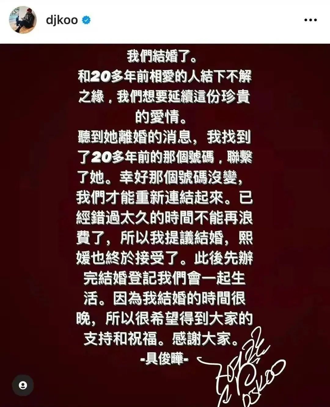 据悉,53岁的具俊晔和46岁的大S,早在20年前就曾相恋,交往一年后因男方经济公司阻拦而分手。