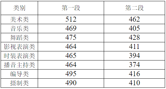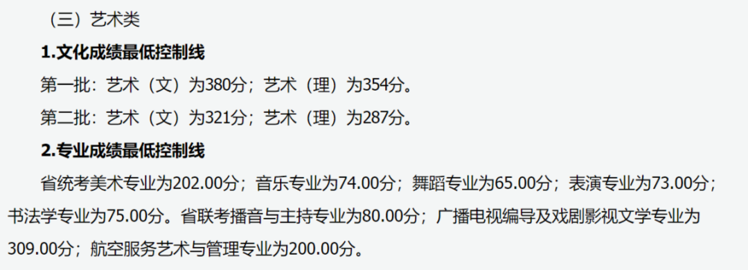 艺术类专业的录取由文化分数线和艺术统考分数线双线控制,各批次的录取最低控制分数线分别为: