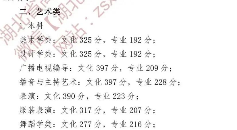 美术与设计学类、音乐学类、舞蹈学类、表演等本科专业:332分;