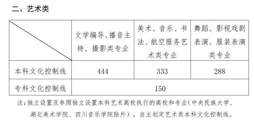 1.教育部批准的独立设置的本科艺术类院校,由学校自行划定录取分数线。