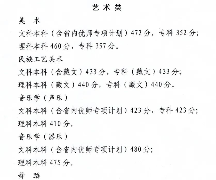 (3)艺术类特殊专业本科文化线,按具体专业在《普通高等学校本科专业目录(2020年)》中所对应的专业类执行的文化线执行。