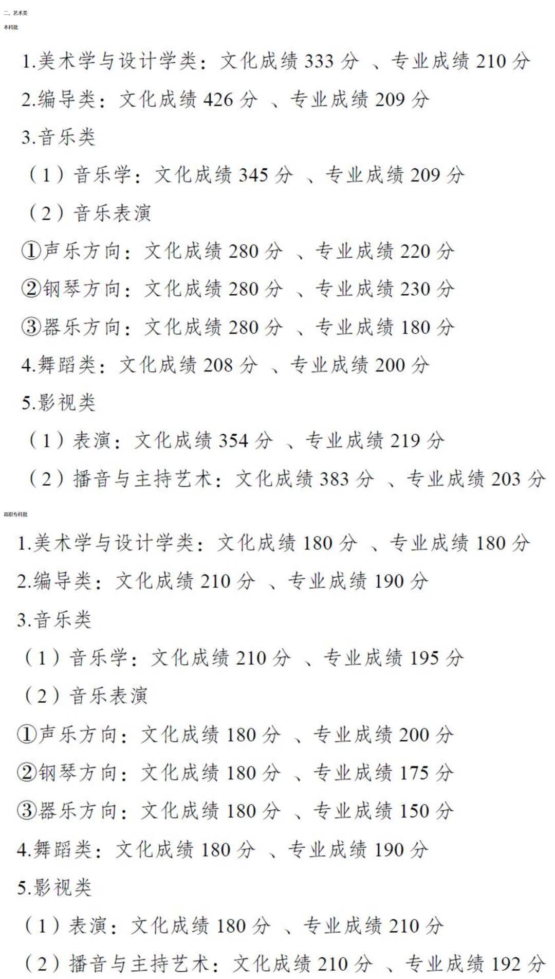 其他艺术类特殊专业文化线按教育部《普通高等学校本科专业目录(2020年版)》及新增专业目录所对应的专业类文化线执行。