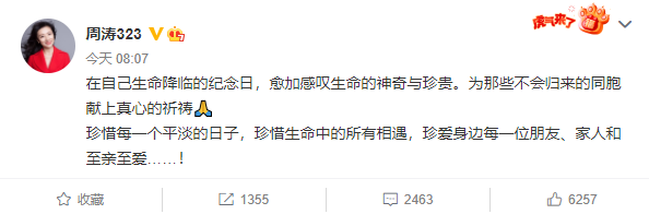 写道“在自己生命降临的纪念日,愈加感叹生命的神奇与珍贵。为那些不会归来的同胞献上真心的祈祷。珍惜每一个平淡的日子,珍惜生命中的所有相遇,珍爱身边每一位朋友、家人和至亲至爱……!”