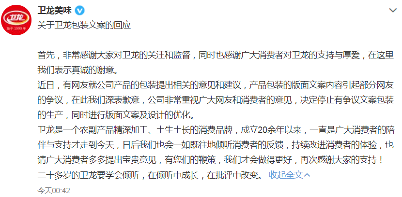 首先,非常感谢大家对卫龙的关注和监督,同时也感谢广大消费者对卫龙的支持与厚爱,在这里我们表示真诚的谢意。