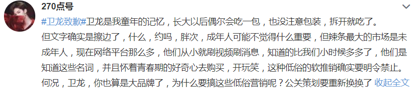 卫龙作为辣味行业的龙头企业,多年来,深受广大消费者的支持和喜爱。品牌营销要新颖有趣有吸引力,当然没错,但只靠低俗文案来吸引人们的眼球,并不能让品牌走的长远。品牌的建设和深入人心,还得是产品本身有市场竞争力。