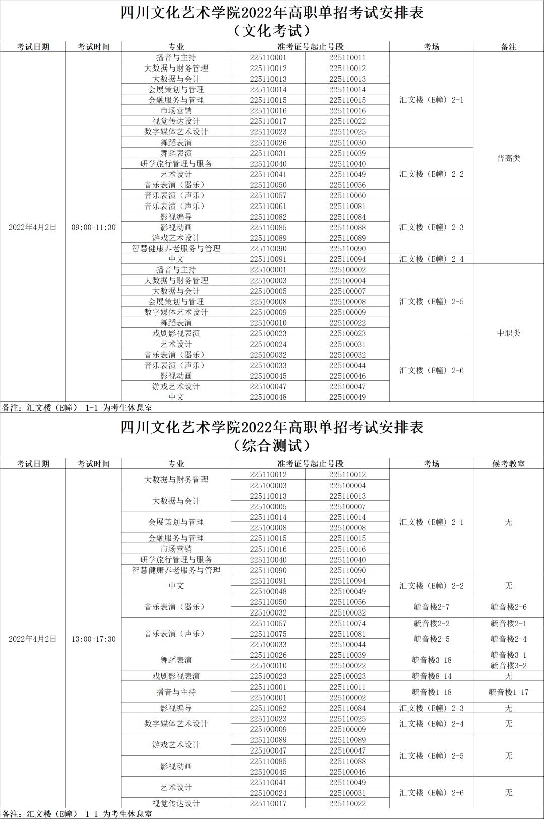附件:1.四川文化艺术学院2022年高职单招考场安排表