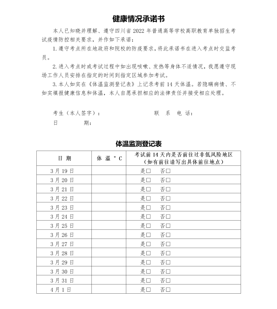 1.按照四川省2022年高职单招考试防疫要求,所有参考考生需从开考前14天起,每日进行体温自我检测,并填写《健康情况承诺书》,进入考点时交于我校。考试前,通过微信公众号“国家政务服务平台”或经当地政府认证的官方平台实名申领防疫健康信息码(以下简称“健康码”),确保在考试结束前,健康码处于“绿色”状态,中高风险地区人员及行程码带“ * ”人员一律不准进校。