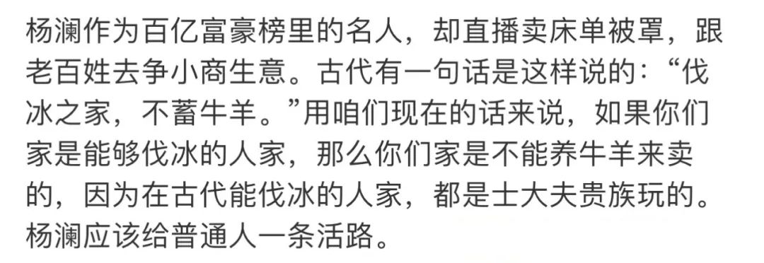 这个比较生僻的典故被网友用在杨澜直播带货上,觉得她百亿身家还跑来卖东西,和那些草根小民抢饭吃,实在是不厚道。