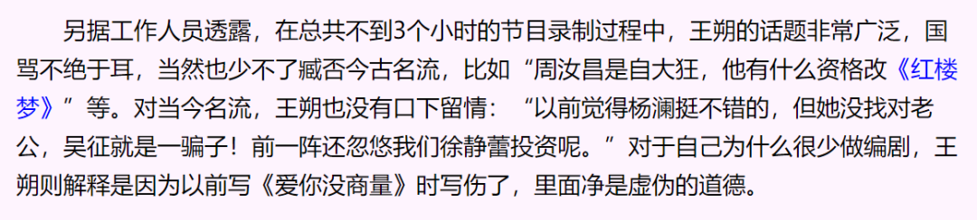 王朔还曾经在节目中大骂吴征是个骗子,王朔他老人家虽然嘴巴大,说话损,但从来不说假话。