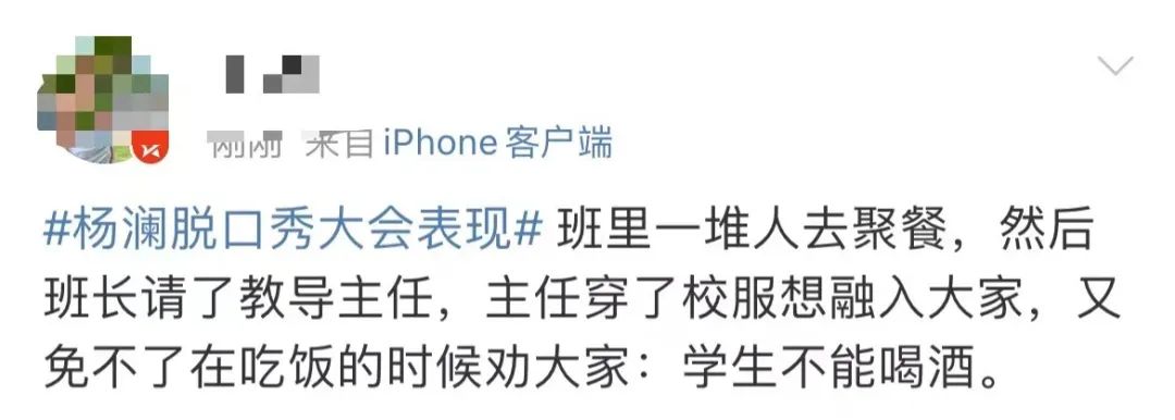 “班里一堆人去聚餐,然后班长请了教导主任,主任穿了校服想融入大家,又免不了在吃饭的时候劝大家:学生不能喝酒。”