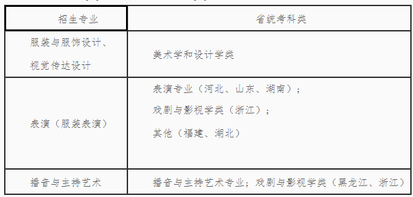省外考生须在生源省份服装表演类(或相近类别)统考合格的前提下,通过我校组织的专业校考,同时文化课成绩过线,按照校考专业课成绩由高分到低分择优录取;河南省考生须表演统考和文化课成绩双过线,按照专业统考成绩择优录取。