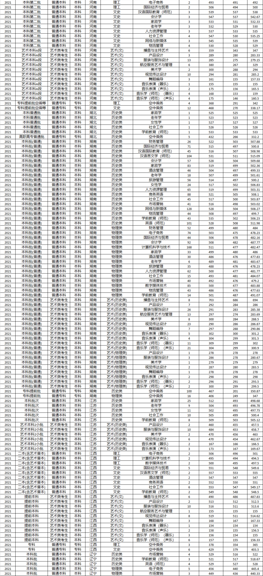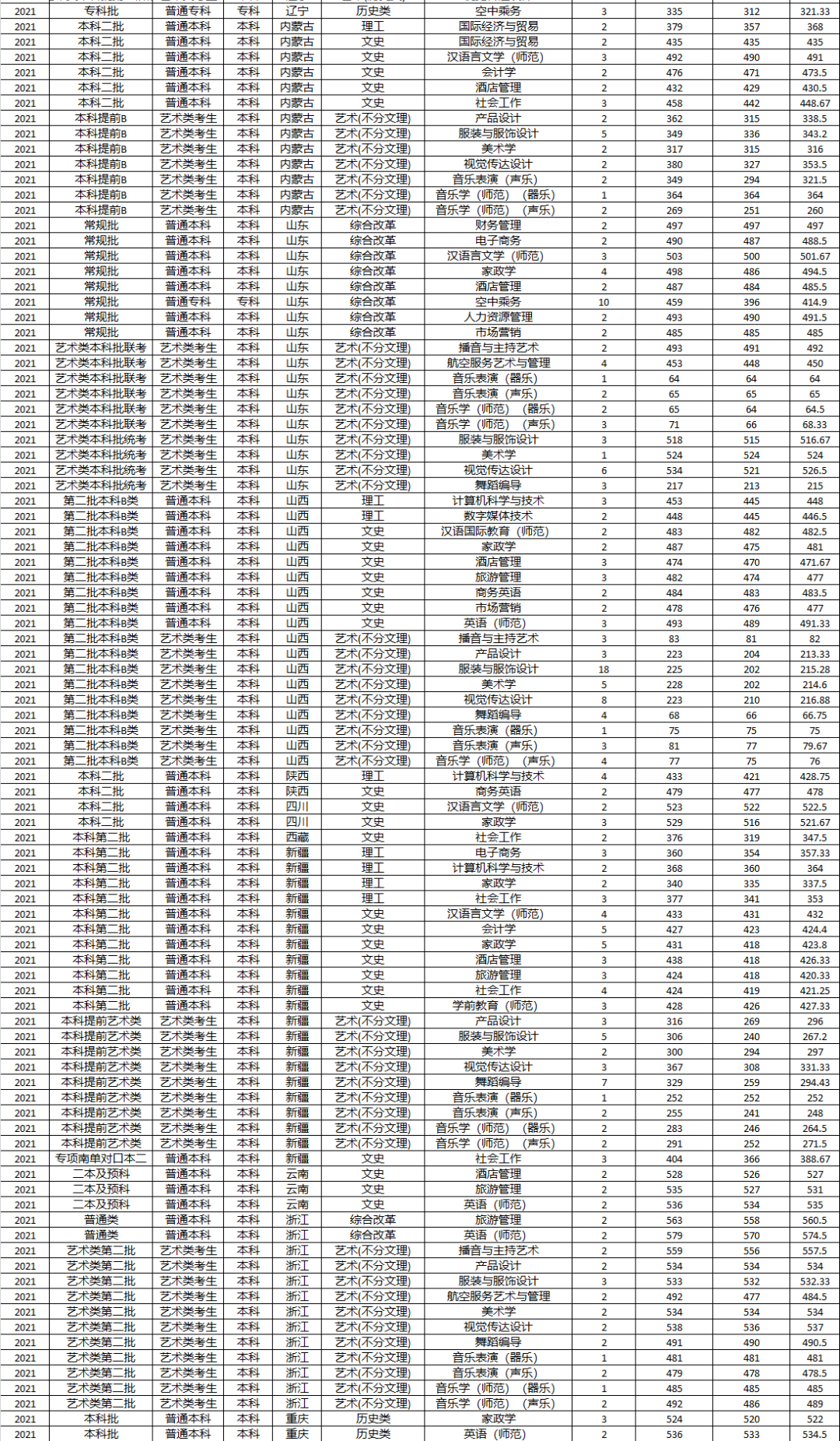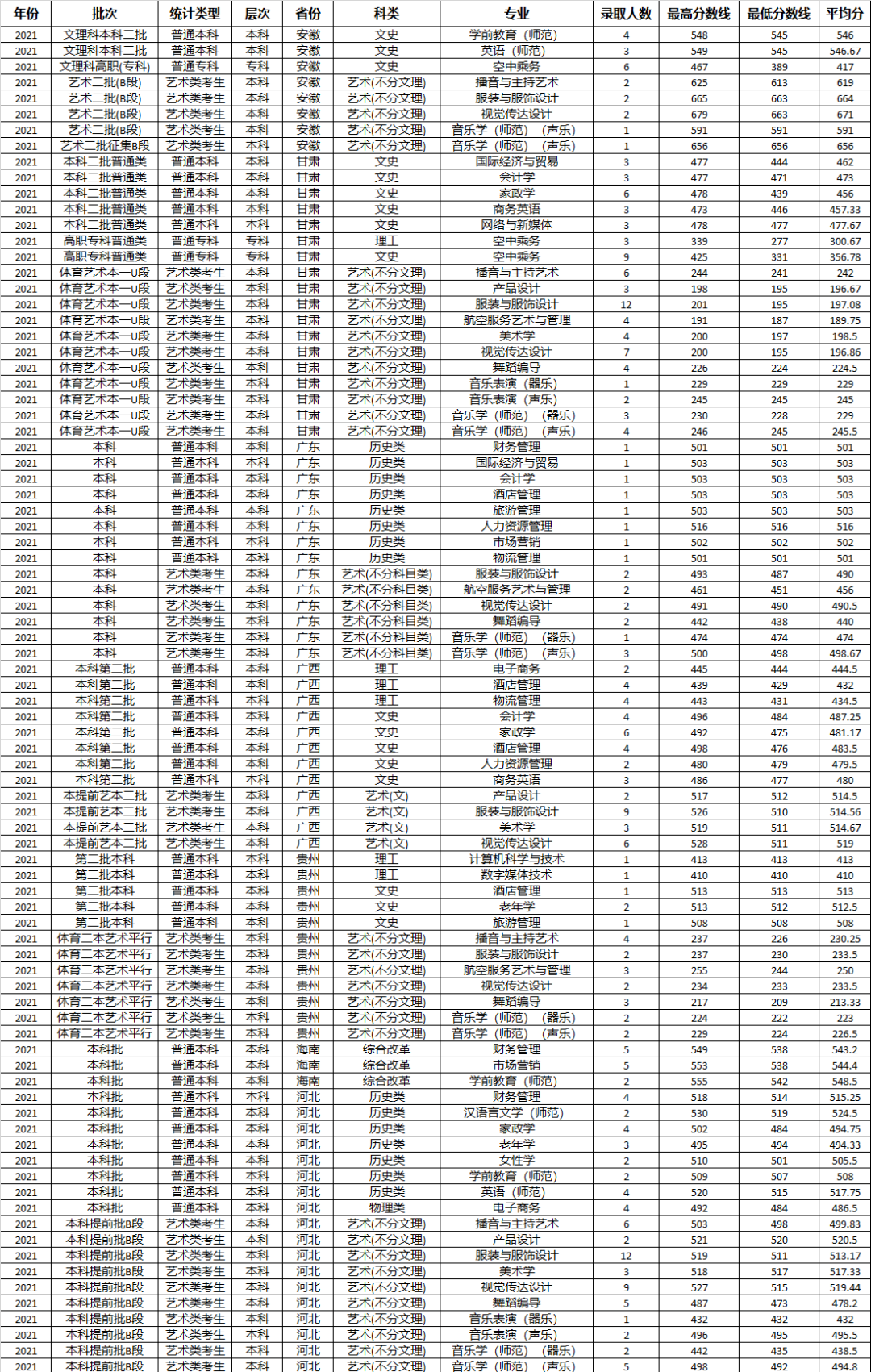 美术学、服装与服饰设计、视觉传达设计、产品设计、音乐学(师范)、音乐表演、舞蹈编导、播音与主持艺术、航空服务艺术与管理