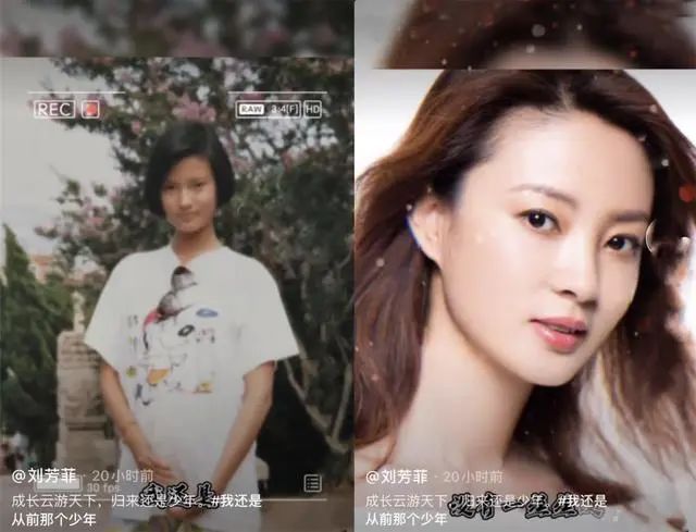 之前刘芳菲还在自己的短视频社交账号上分享了一张自己小时候的照片与长大后的对比,并配文"成长云游天下,归来仍是少年"。