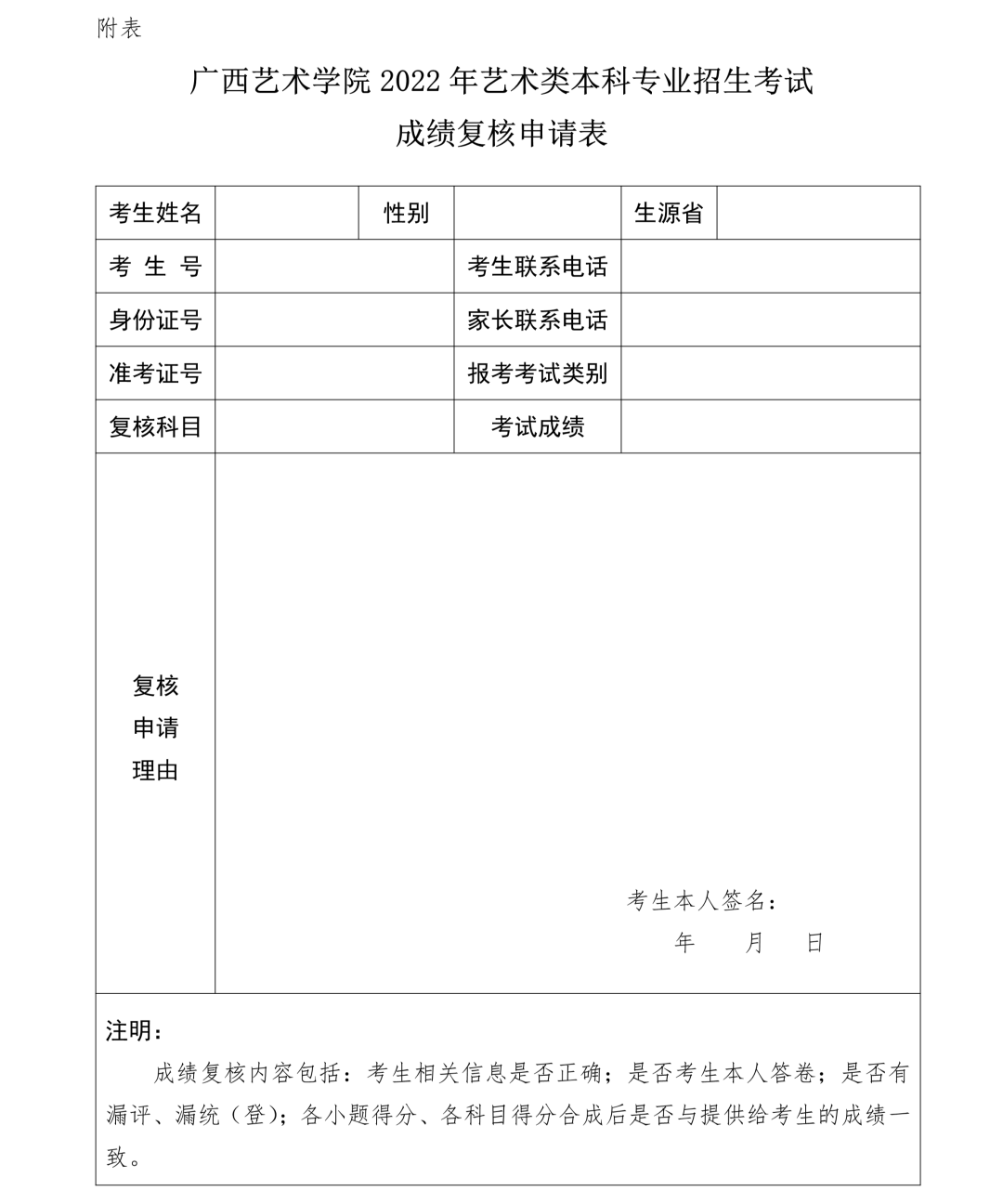 附件:广西艺术学院2022年艺术类本科专业招生考试成绩复核申请表